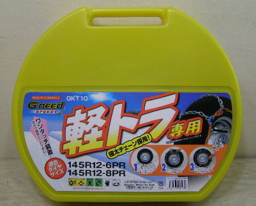 説明、特徴 軽トラックや商用軽ワゴンに特化したタイヤチェーン。ワンタッチラダータイプチェーン。軽量コンパクト収納。速度30キロ以下走行。 ※軽トラックは農村部などでは非常に重宝されている車であり、田畑を持っている兼業農家ではセカンドカー、サードカーとして農機具の運搬や生活の足としても使われている。また、商用軽ワゴンについても、多くの宅配業者で使われており軽トラに特化したチェーンが発売されるのはありがたい。 製品画像